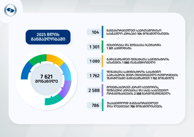 02.02.2026ფინანსთა სამინისტროს აკადემიამ 2025 წელს 7621 მსმენელი გადაამზადა. მათ შორის, ფინანსთა სამინისტროს სისტემის 1080 თანამშრომელი, ფინანსთა სამინისტროს სახაზინო სამსახურის მიერ ინიცირებული რეფორმების ფარგლებში გადამზადდა 1762 მსმენელი, კერძო სექტორის, ფიზიკური პირებისა და სხვა საბიუჯეტო სექტორის 2588 წარმომადგენელი, საერთაშორისო სასწავლო კურსებში მონაწილე 104 პირი. ტესტირება და შეფასება ჩაუტარდა 1301 კანდიდატს, უსასყიდლოდ განხორციელდა ღია ლექციები და სასწავლო კურსები 786 მონაწილისთვის.